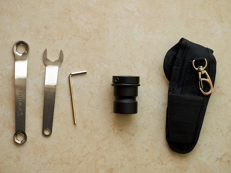 Concretamente se trata de dos llaves allen, unas pequeñas llaves planas, y una mini barra central (para sustituir la de serie en aquellos acercamientos a ras de suelo), todo esto en una práctica funda.