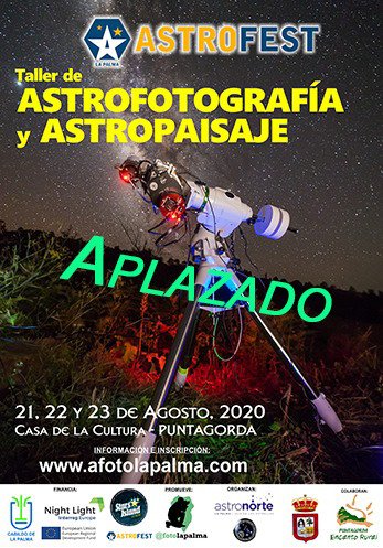 Debido a la pandemia del Covid-19 y su posible resurgimiento, y en seguimiento de las recomendaciones gubernamentales, se aplaza el Taller de Astrofotografía y Astropaisaje, previsto del 21 al 23 de agosto. Ahora lo importante es la salud, y luego podremos seguir disfrutando de la vida y de nuestras aficiones.