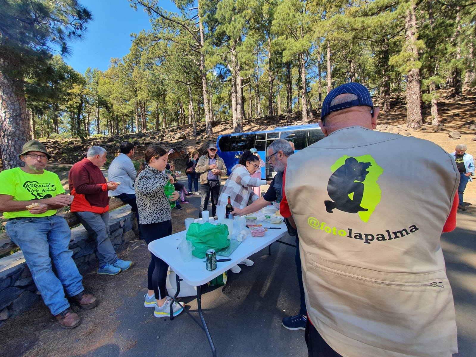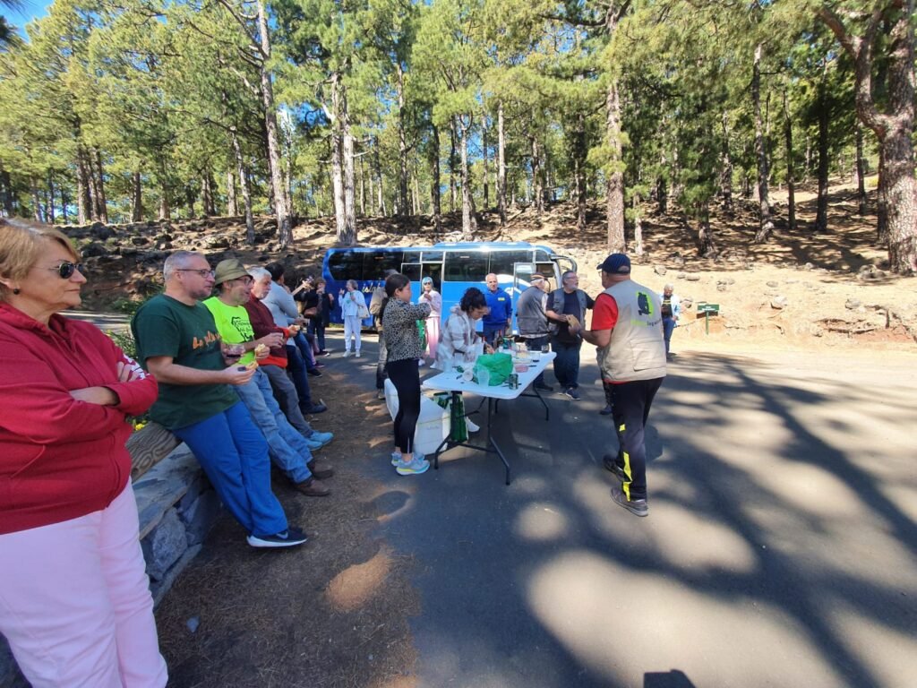 El recorrido fue el habitual, al estar presentes todos los apuntados salimos un poco antes de las 8:30 de la mañana de Los Llanos, parada en Santa Cruz para recoger al resto de compañeros y subida por Mirca. Tras un ascenso tranquilo y sin darnos casi cuenta llegamos a nuestras primera parada en la entrada del Pico de la Nieve, vimos a muy pocos visitantes, en esta ocasión ni siquiera el cuervo nos vino a visitar. Hicimos un desayuno con pan, jamón, chorizo, vino, cerveza y estrenamos una nueva mesa que adquirimos para la asociación. Y el tiempo con una temperatura agradable, sin lluvia y algunas nubes altas hacían bastante agradable el estar en la zona, y así continuó todo el día por la zona alta de la isla.