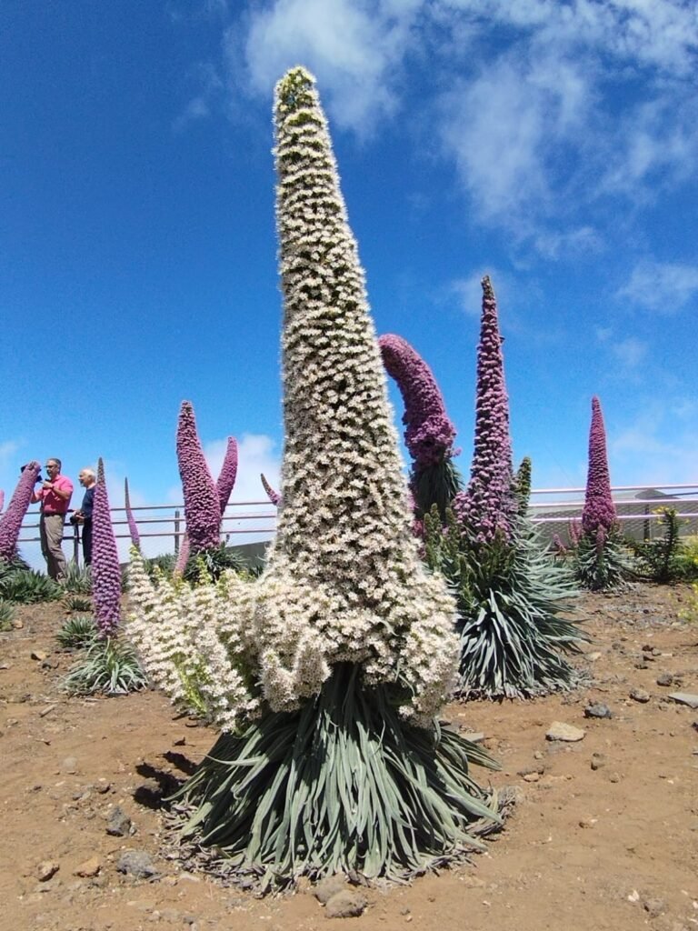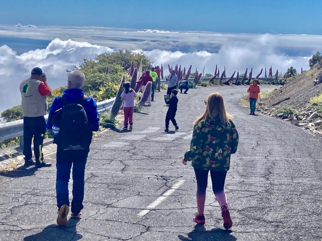 Volvimos a la carretera y continuamos ruta, pero dada lo hora nos fue imposible subir al Roque, y nos dirigimos hacia el “Centro de Visitantes Roque de Los Muchachosâ€. Pudimos ver la cantidad de tajinastes que hay en sus jardines incluido un tajinaste blanco, y como coincidió que era día de puertas abiertas entramos para ver el vídeo que allí se proyecta de forma habitual, y hacer un muy breve recorrido por el lugar.